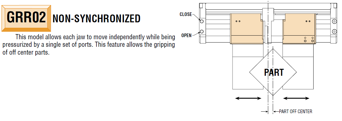 - รองรับการทำงานทั้งแบบประสานงาน (Synchronize) และ แบบไม่ประสานงาน (Non-Synchronize) แบบประสานงานนั้น ปากของ Gripper จะเคลื่อนที่ไปพร้อมๆกันทั้ง 2 ฝั่ง ด้วยแรงที่เท่ากันและความเร็วเท่ากันทำให้วัสดุที่ต้องการหยิบจับนั้น ถูกจับอยู่ที่จุดศูนย์กลางพอดี